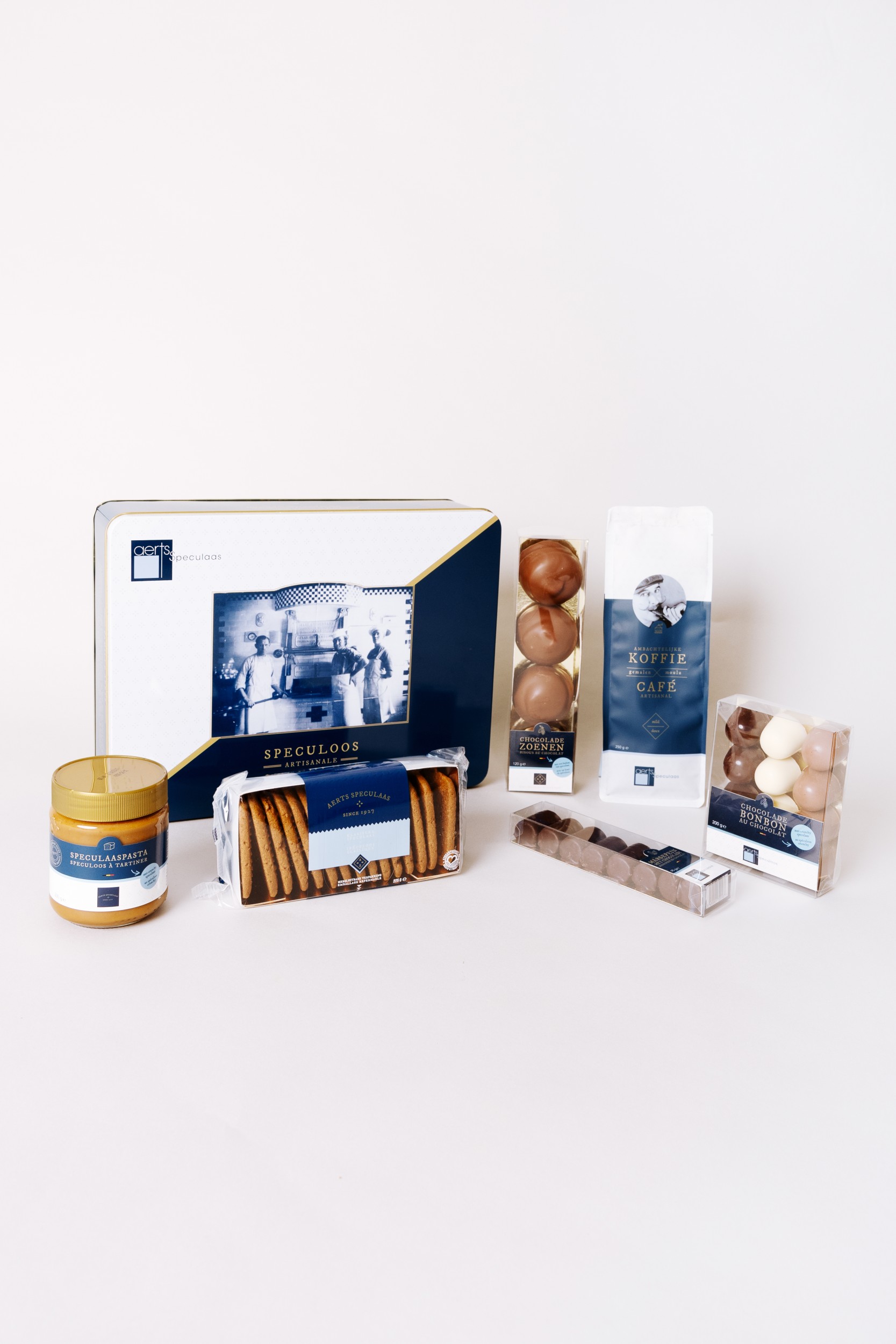 Een stijlvol blikken geschenkdoos gevuld met de lekkerste ambachtelijke specialiteiten van Aerts Speculaas. In deze unieke geschenkdoos ontdek je onze crunchy speculaaspasta, de overheerlijke en smeuïge chocoladebonbons met speculaas, chocoladezoenen en marsepein omhuld met een fijn laagje pure chocolade en uiteraard onze ambachtelijke klassieke speculaas. In deze geschenkdoos kun je ook proeven van een kopje koffie dankzij onze heerlijke selectie koffiebonen. De geschenkdoos omvat het beste van ons volledige assortiment.